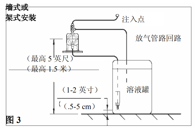 墙式或架式安装请参阅图 3。将吸入管连接到化学泵的吸入阀上。吸入阀是较低的阀门。其管道应足够长,使底阀/过滤器组件悬挂在化学储罐底部上方 1-2 英寸(2--5 cm)处。储罐应有盖,防止化学药品污染。