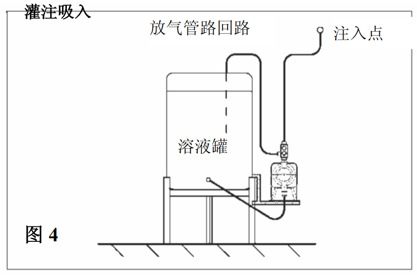灌注吸入式安装(计量泵安装在化学储罐底座上,图 4)是最安全的安装方式,建议用于极