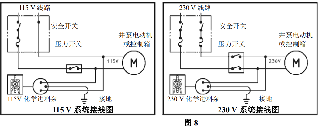 小心:从同一触点闭合运行多台泵会损坏泵的电路。如果要求这类运行,必须使用多触点控制继电器或相似方法使泵的电路之间互相电气隔离。