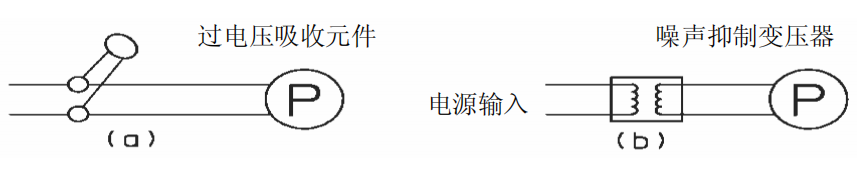 个插座,则应采取措施,(a)在泵的电源连接上安装过电压吸收元件(可变电阻,波冲电阻最小 2000A),或(b)安装噪声抑制变压器。