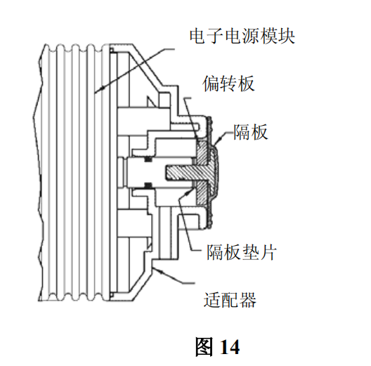 将隔板偏转板滑到隔板双头螺栓背后,半径侧朝向隔板。然后将两片垫片滑入到隔板的双头螺栓上,将隔板拧入 EPM 装置。参阅图 14。顺时针旋转隔板,直到偏转板和垫片紧靠电磁线圈轴,隔板停止转动。如果适